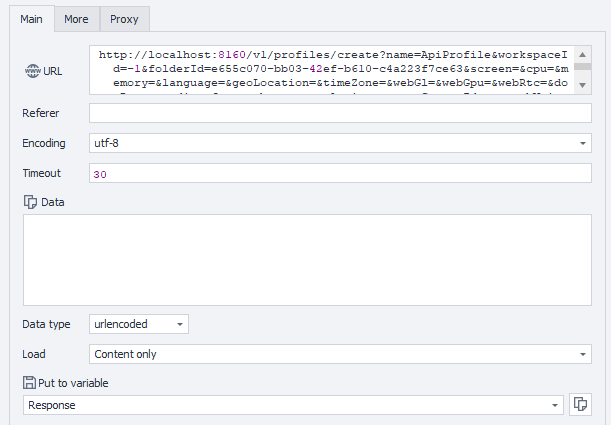 curl 'http://localhost:8160/v1/profiles/create?name=&workspaceId=-1&folderId=&screen=&cpu=&memory=&language=&geoLocation=&timeZone=&webGl=&webGpu=&webRtc=&domRect=&audio=&fonts=&battery=&plugins=&proxyServerId=&speechVoices=&cookies=¬es=&tags=' \